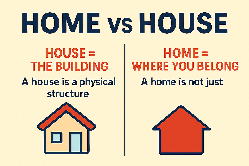 A house is simply a physical structure — walls, roof, doors, and windows — that provides shelter. A home, however, is much more than just bricks and cement; it is the emotional heart where bonds are formed, love is shared, and memories are created. While anyone can build or buy a house, it takes connection, care, and belonging to truly make it a home. In short, a house is where you live, but a home is where you truly belong.